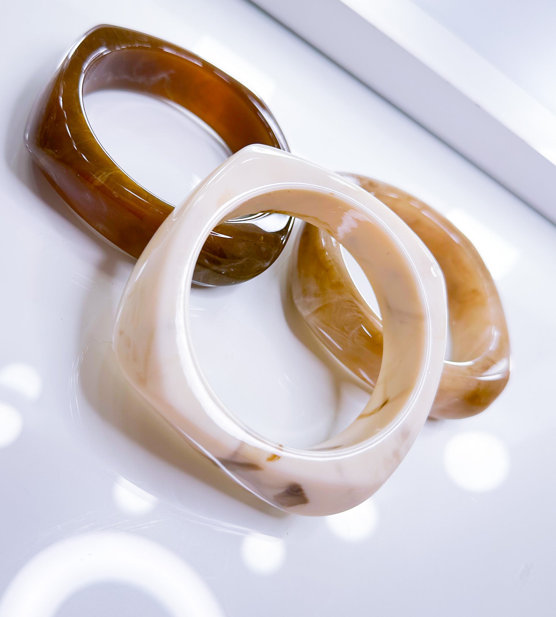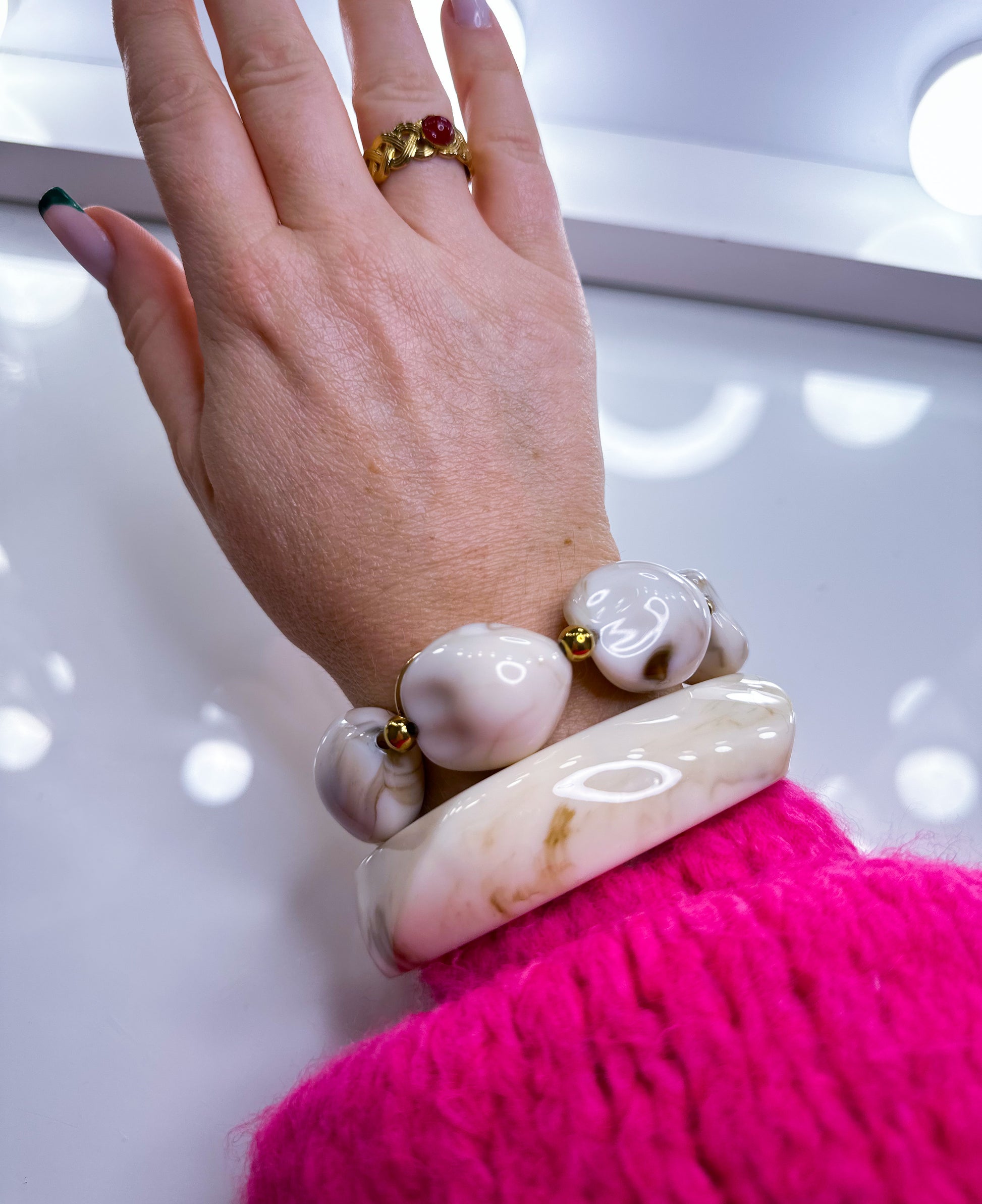 Dieses edle Armreif vereint zeitlose Eleganz mit modernem Statement-Charme. Die breiten, glänzenden Armreifen in marmorierter Optik wirken wie kleine Kunstwerke und setzen dein Outfit perfekt in Szene.