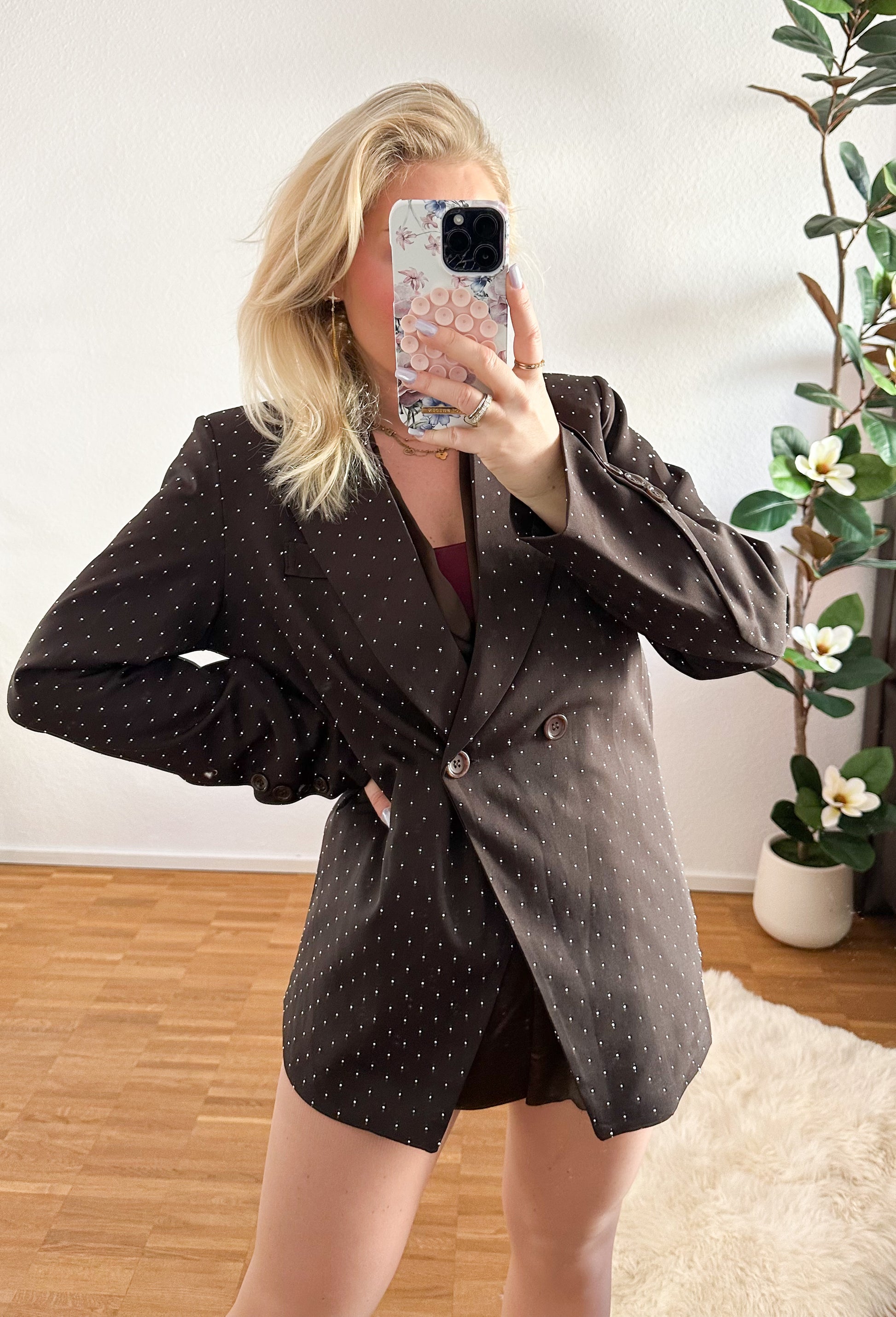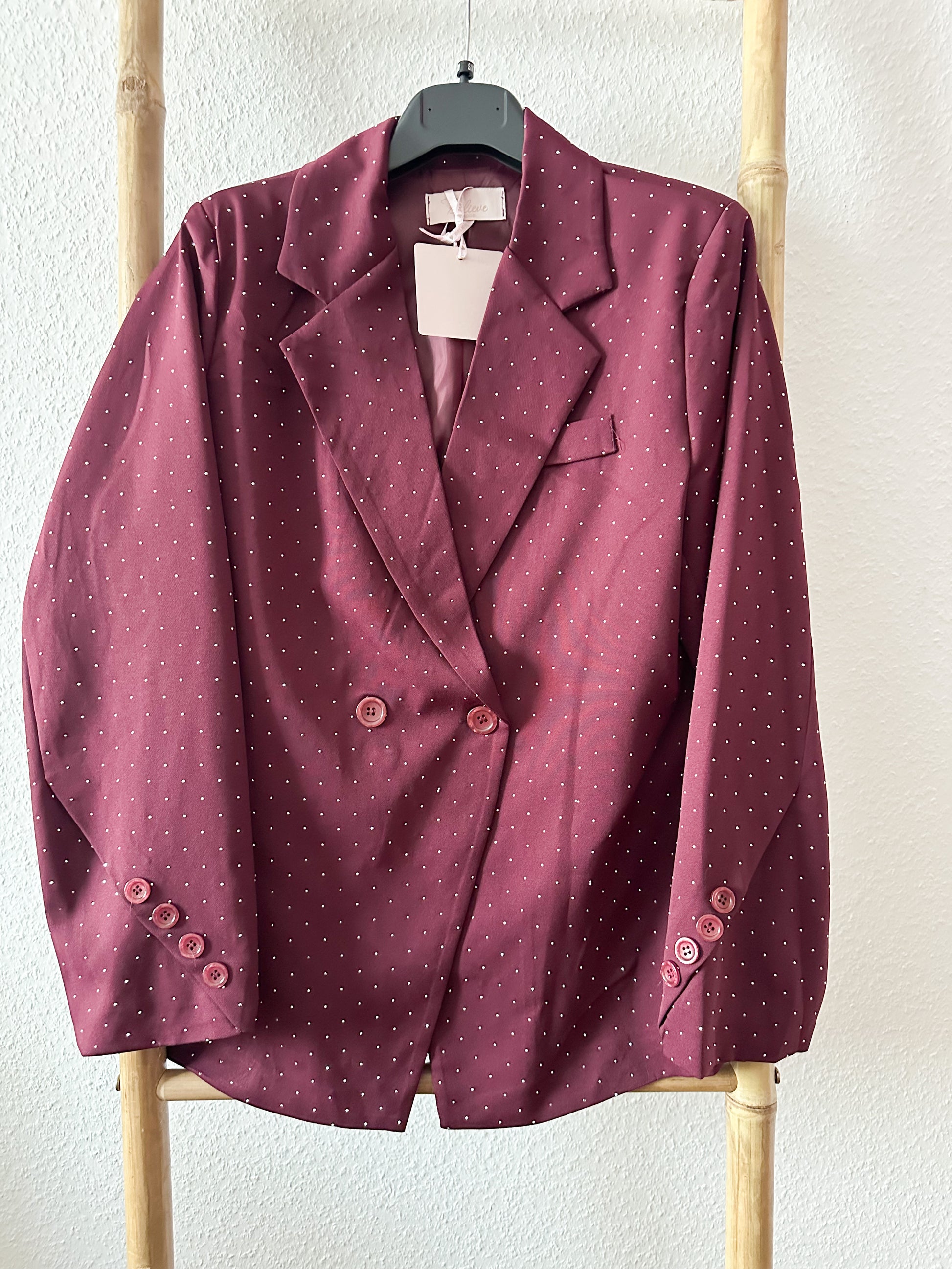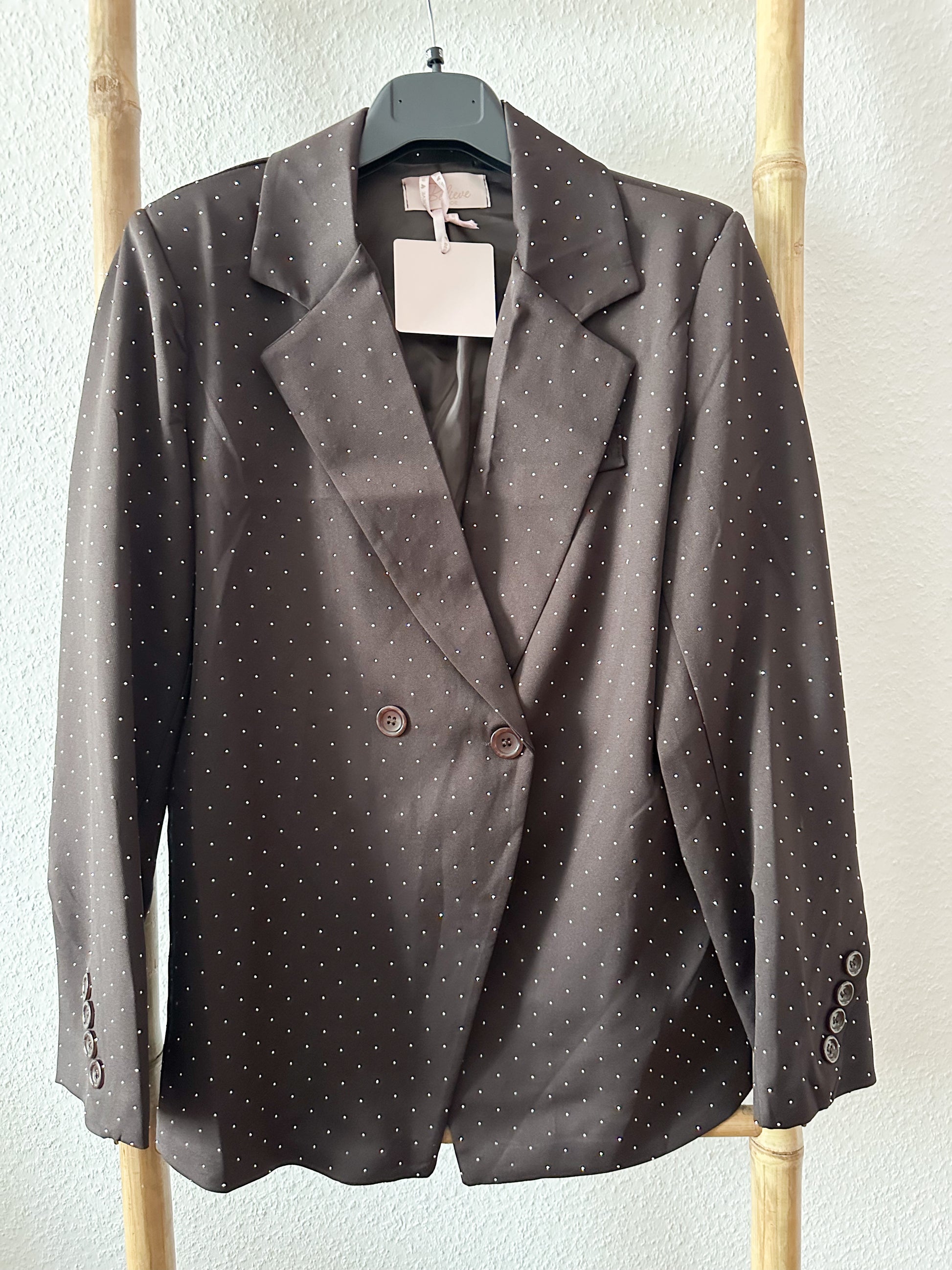 - Feine Strass-Details: Der gesamte Blazer ist mit kleinen, hochwertigen Strasssteinen verziert – für einen dezenten, aber edlen Glitzer-Effekt.