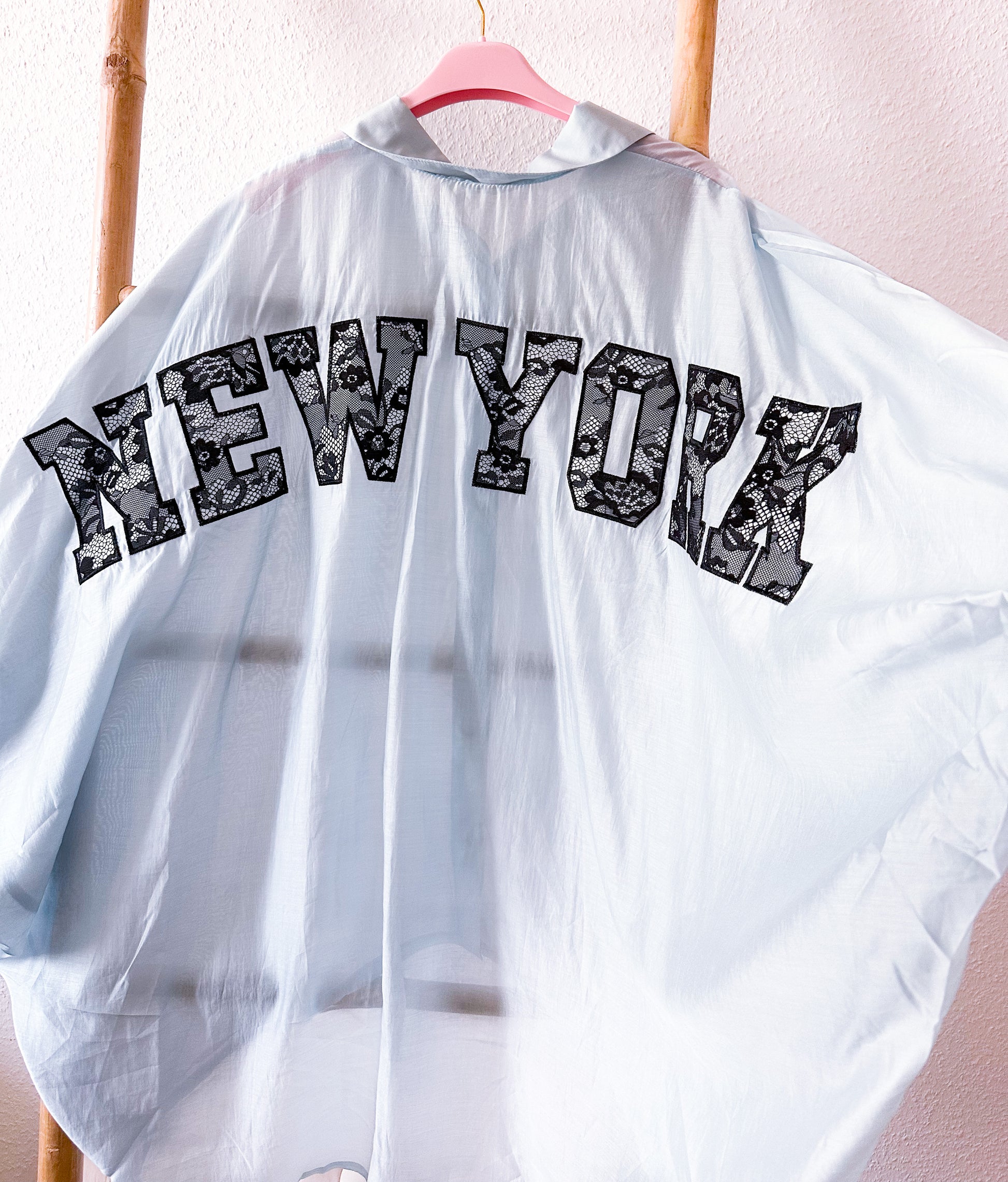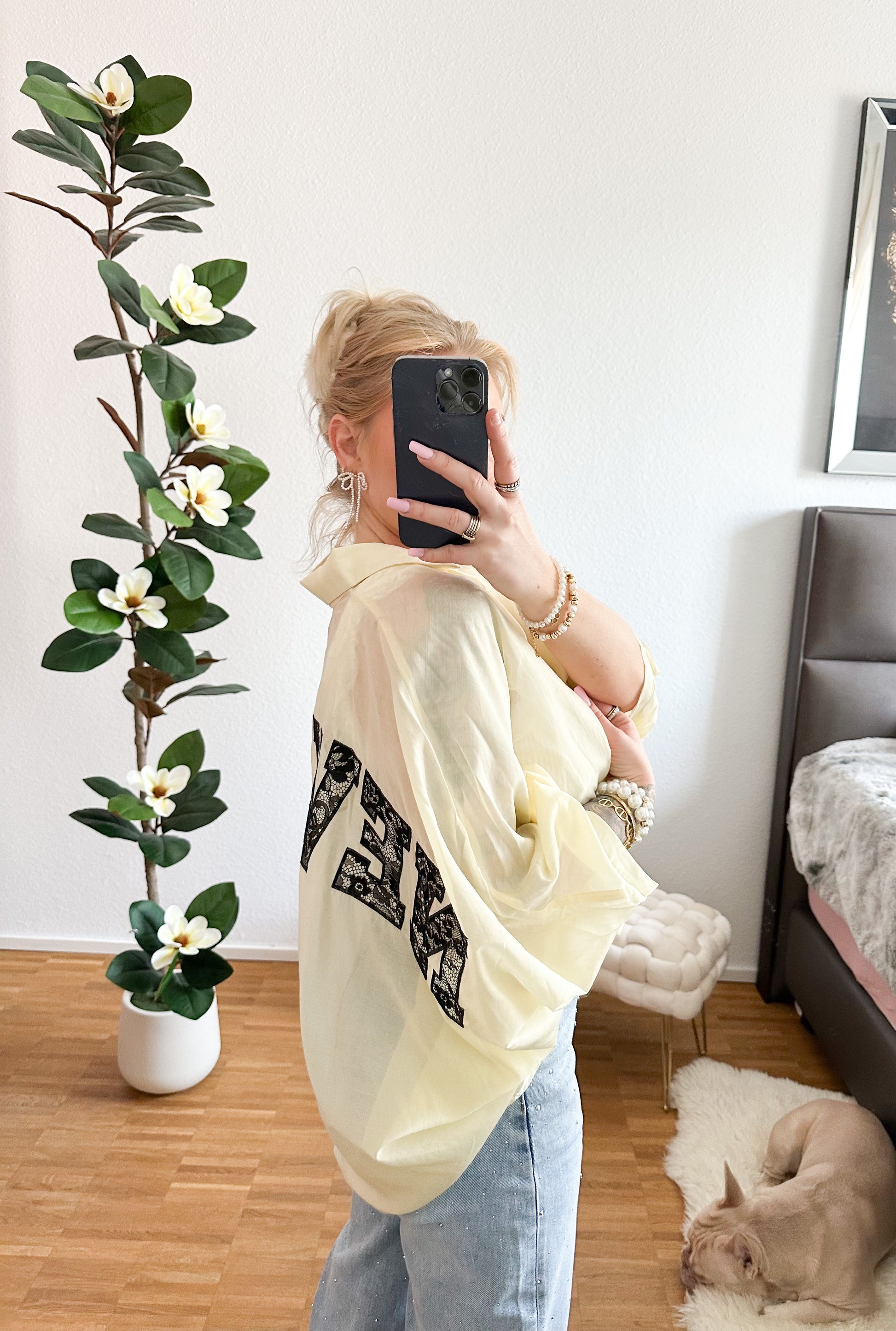 Das Highlight: Der große „WOW“-Schriftzug auf dem Rücken mit edler Spitzenoptik verleiht der Bluse einen besonderen Eyecatcher-Moment – perfekt für alle, die auffallen wollen, ohne laut zu sein.