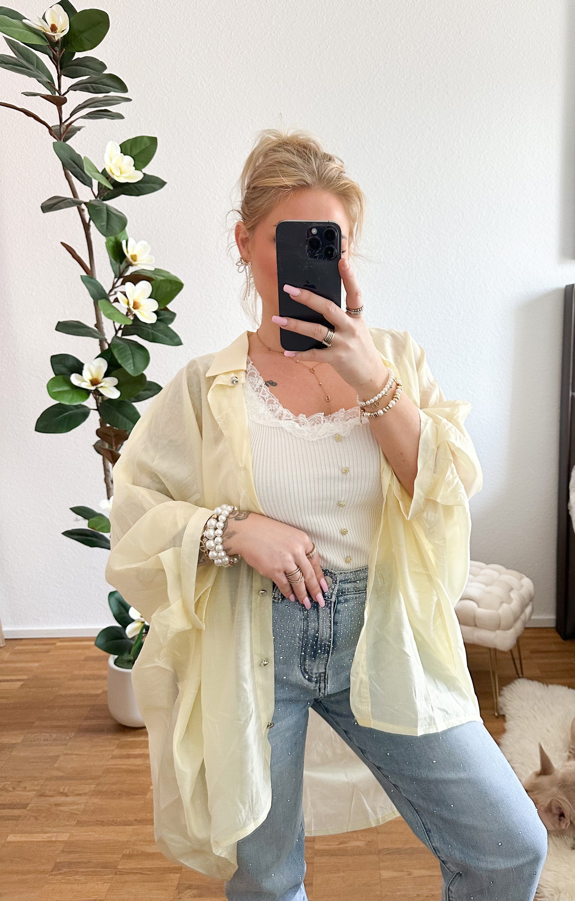 Diese leichte Oversize-Bluse ist ein echtes Fashion-Statement. Der zarte, halbtransparente Stoff in sanftem Cremegelb fällt locker und fließend und sorgt für einen modernen, lässigen Look.