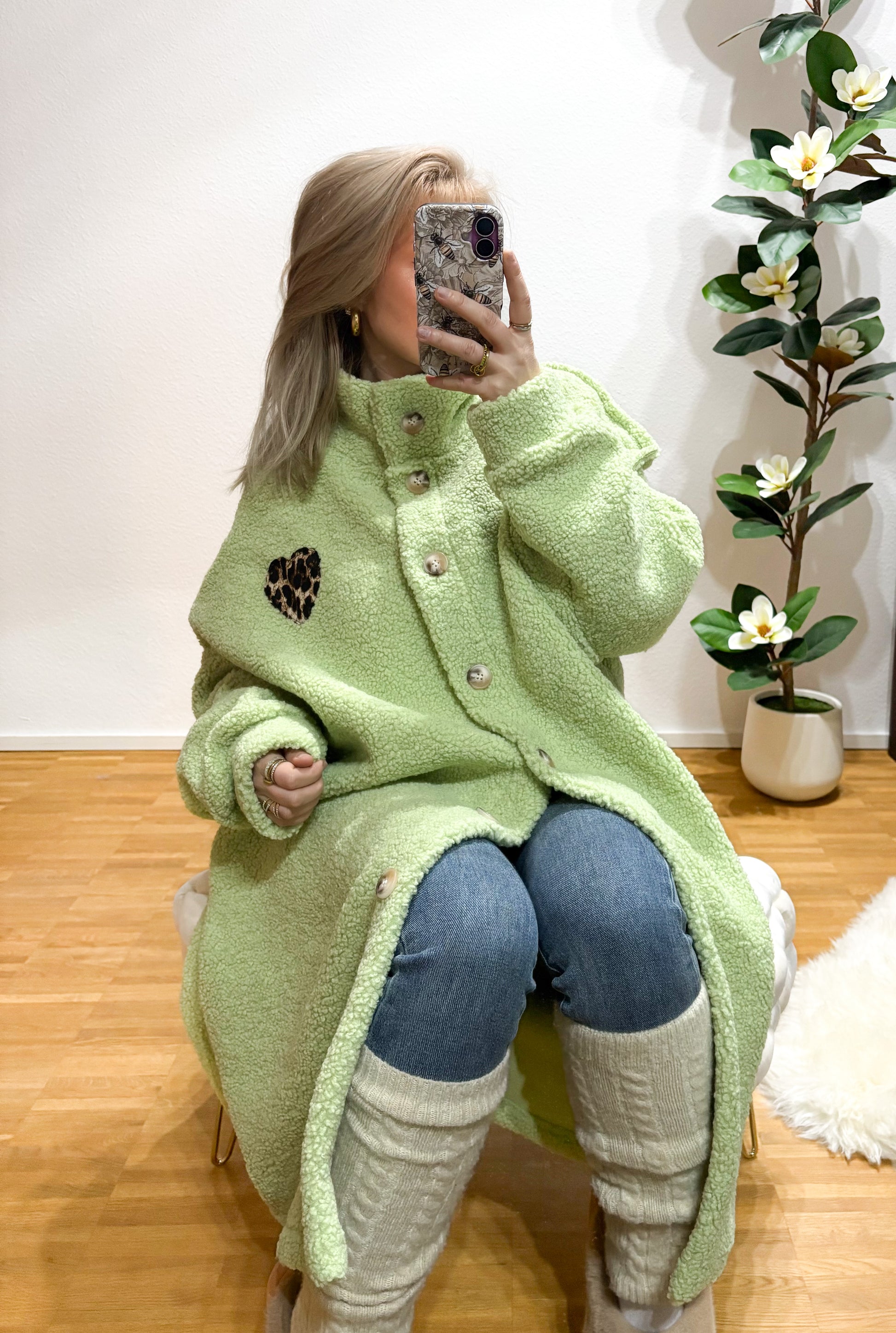 Dieser Teddy Mantel mit Leo-Herz ist ein absoluter Eyecatcher! Das kuschelig weiche Teddy-Material trifft auf ein liebevolles Herz-Detail im Leo-Design – perfekt für alle, die Cozy-Looks mit einem besonderen Akzent lieben.