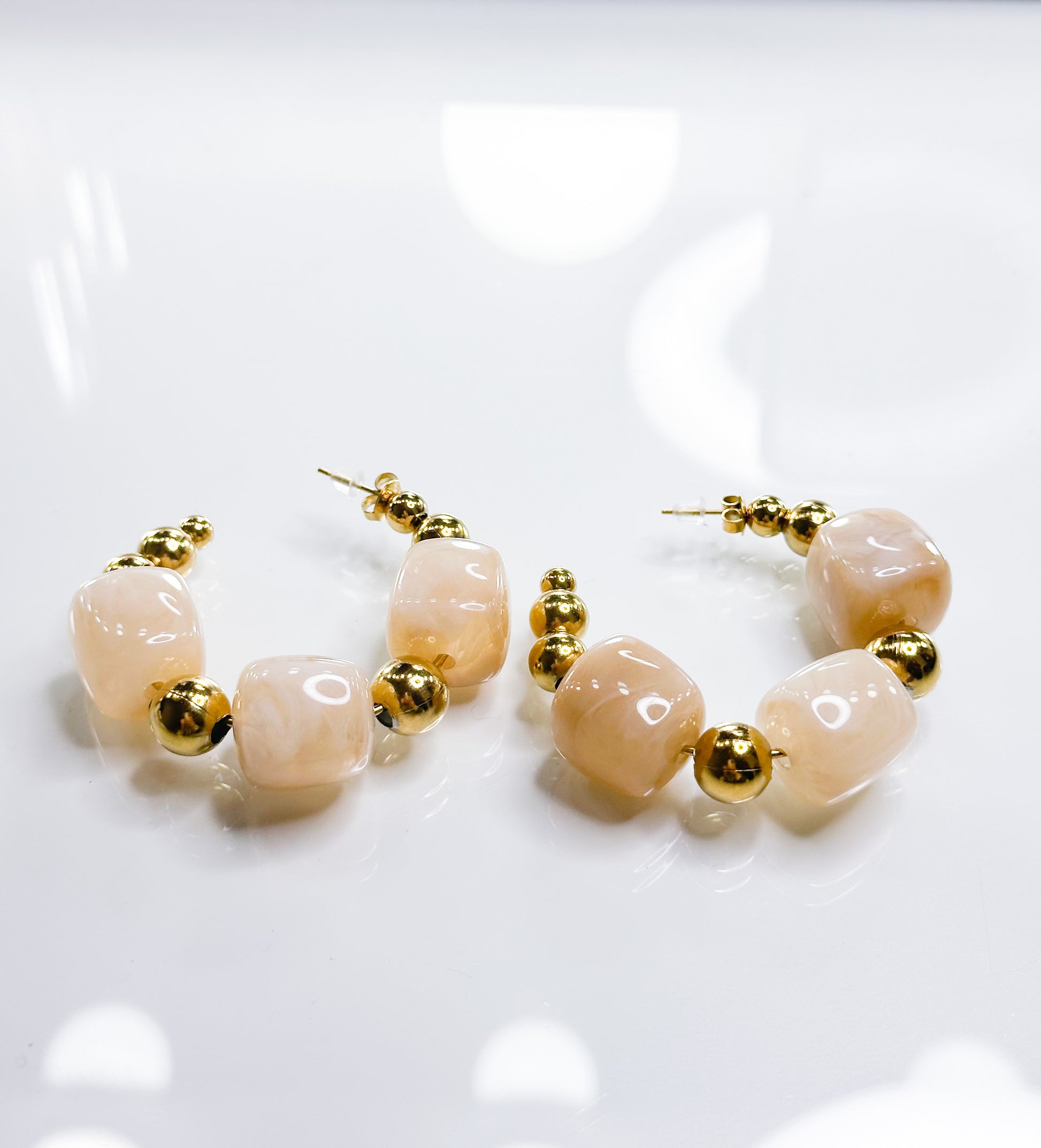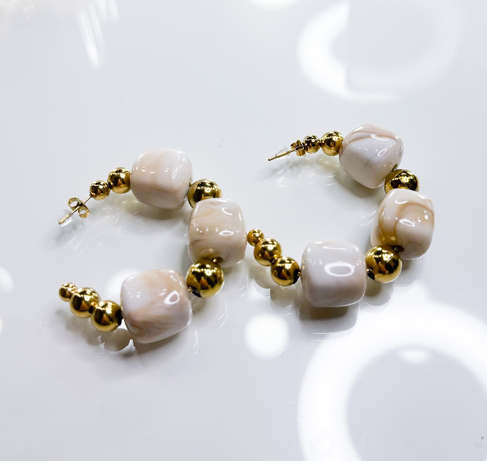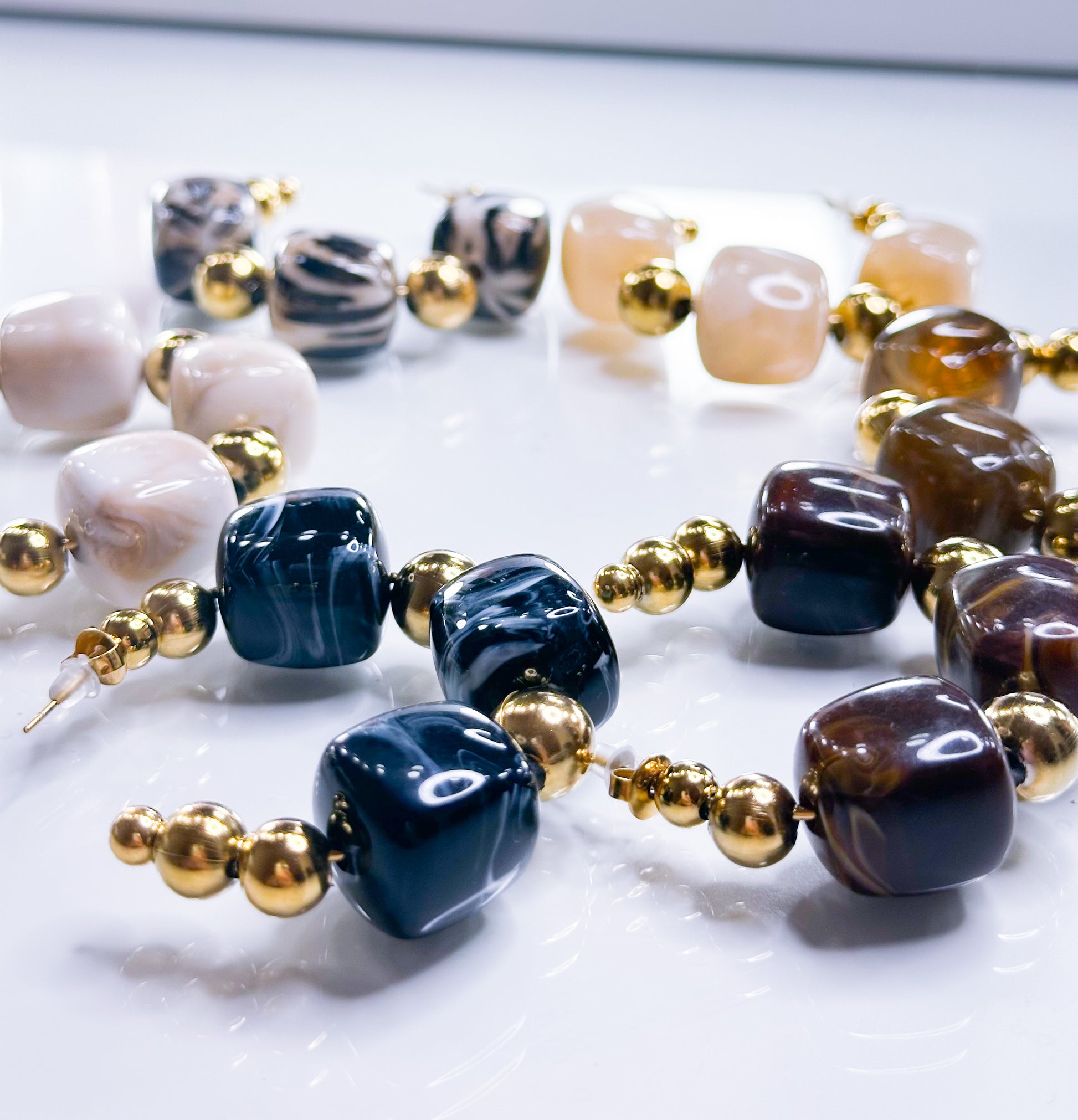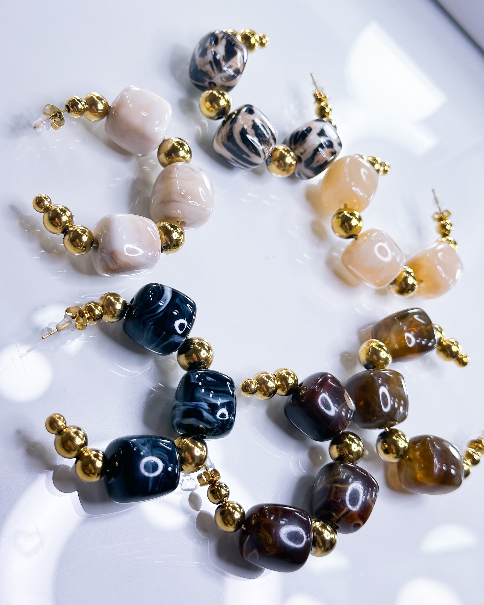 Die glatten Goldbeads verbinden sich mit den marmorierten Resin-Steinen, die jedes Paar zu einem eigenen kleinen Kunstwerk machen. Leicht, robust und bereit, jedes Outfit ein Stück edler zu machen.