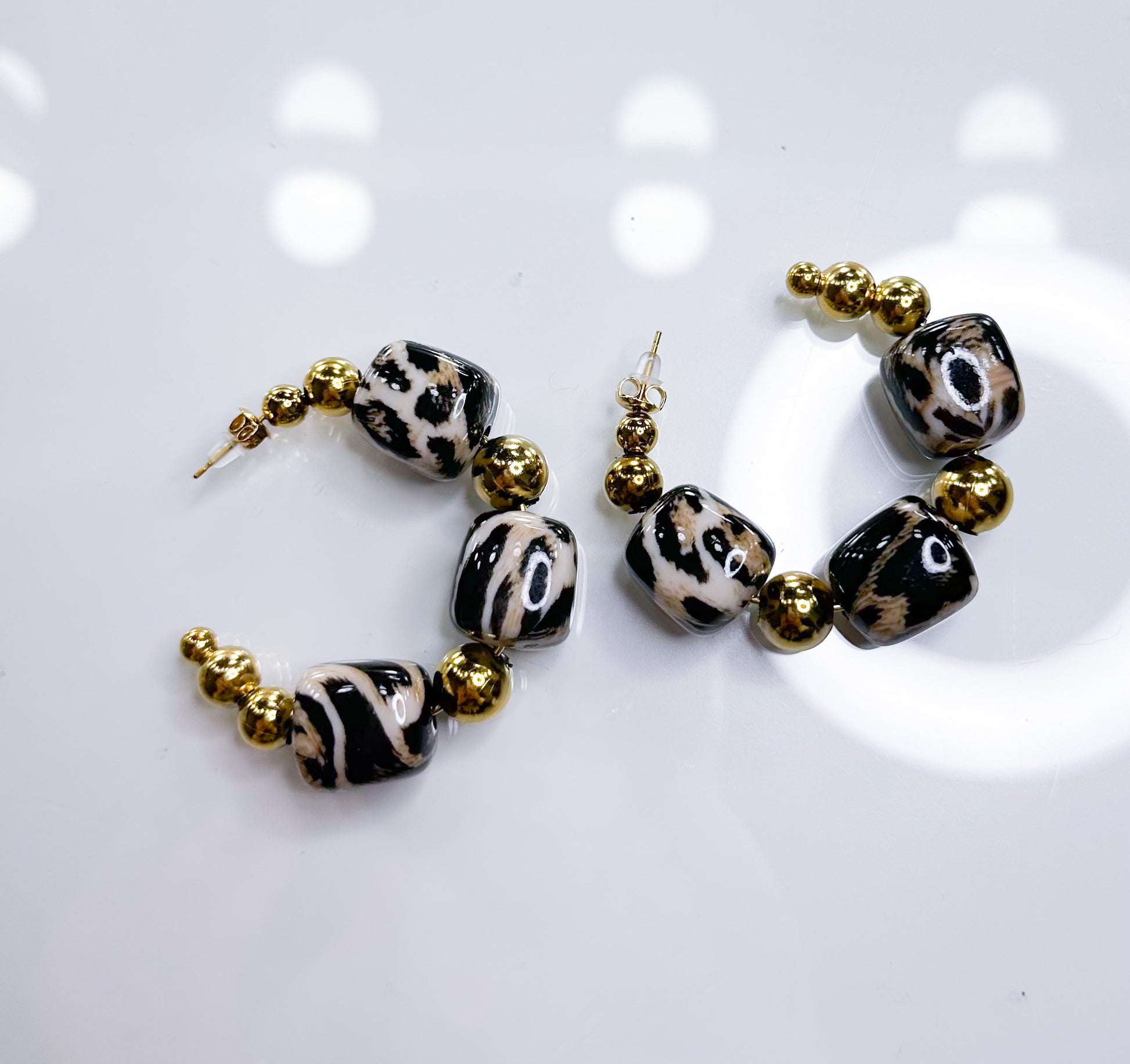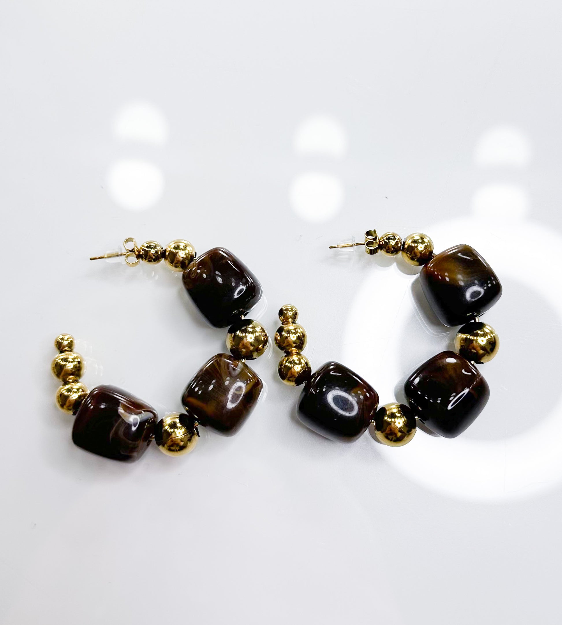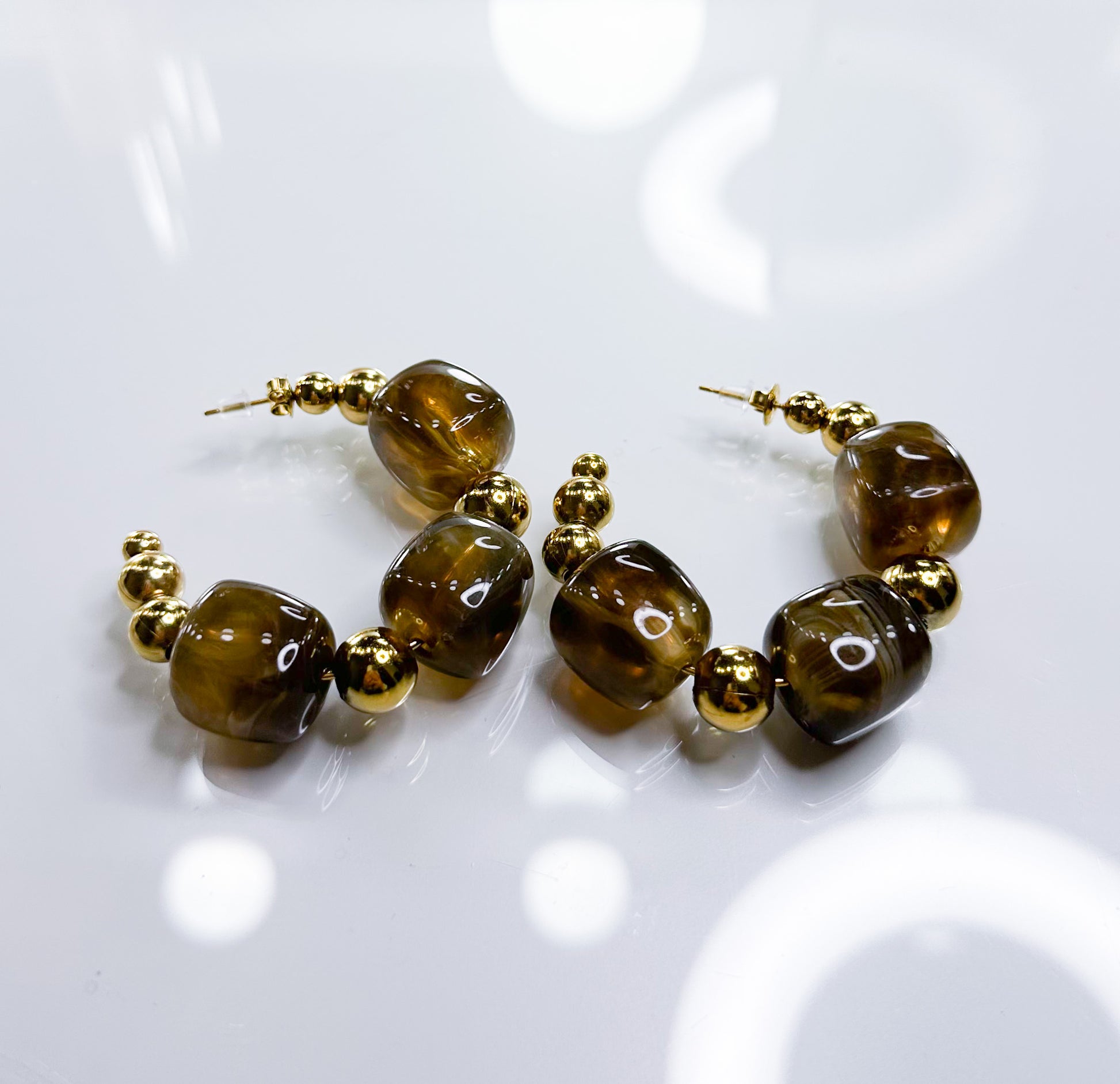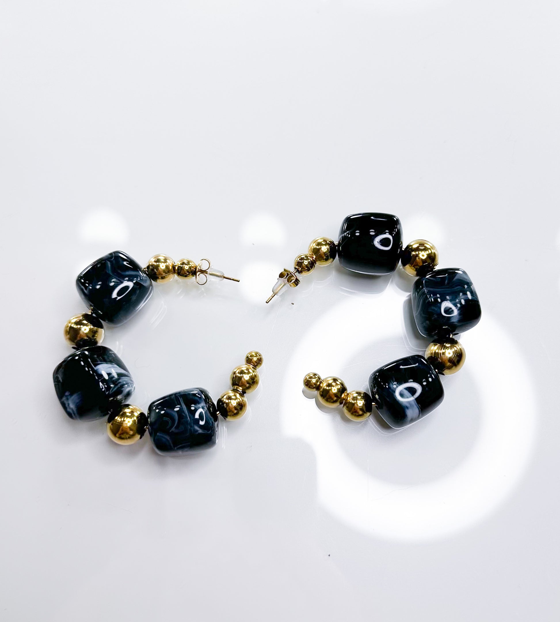 Die glatten Goldbeads verbinden sich mit den marmorierten Resin-Steinen, die jedes Paar zu einem eigenen kleinen Kunstwerk machen. Leicht, robust und bereit, jedes Outfit ein Stück edler zu machen.