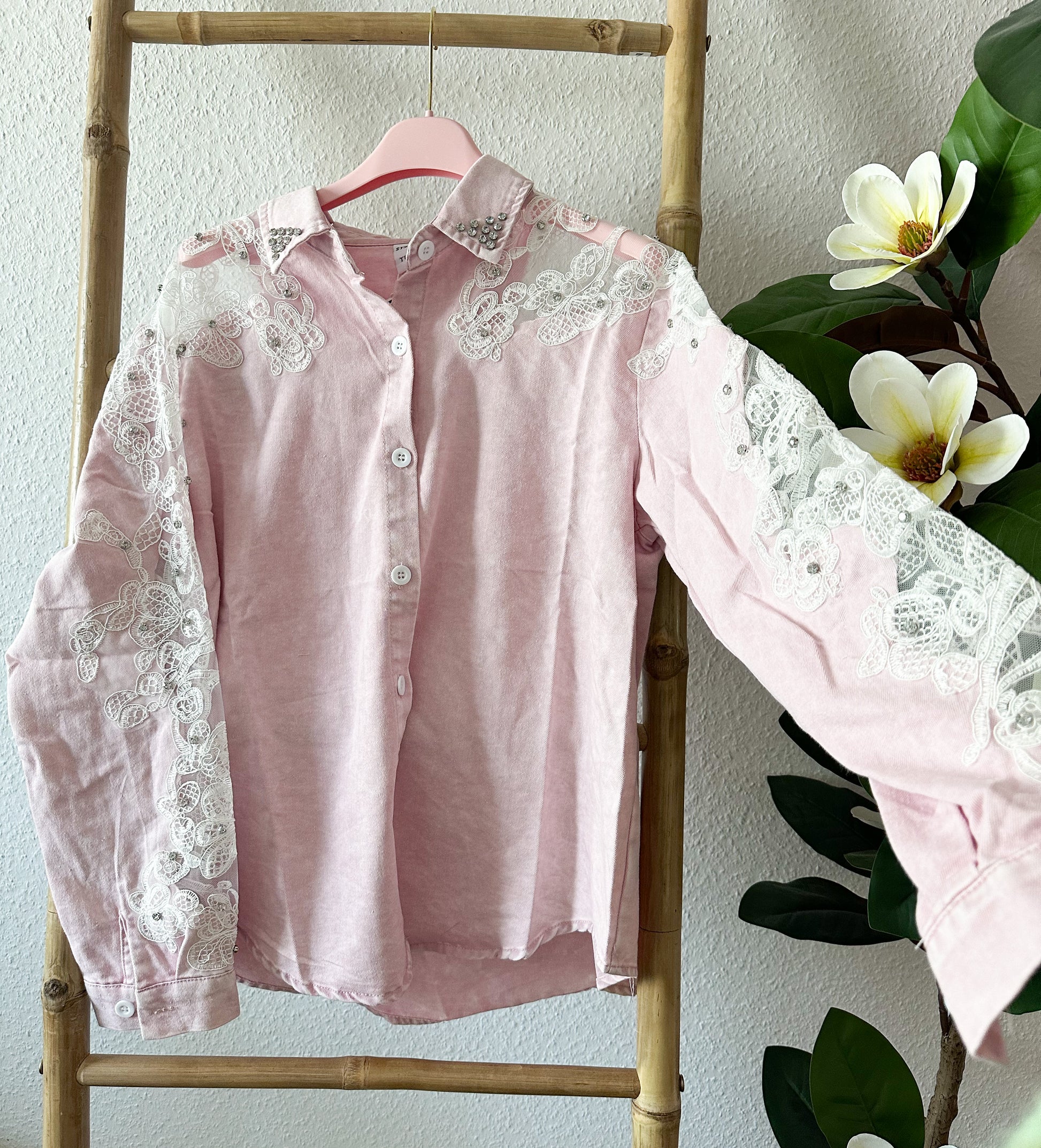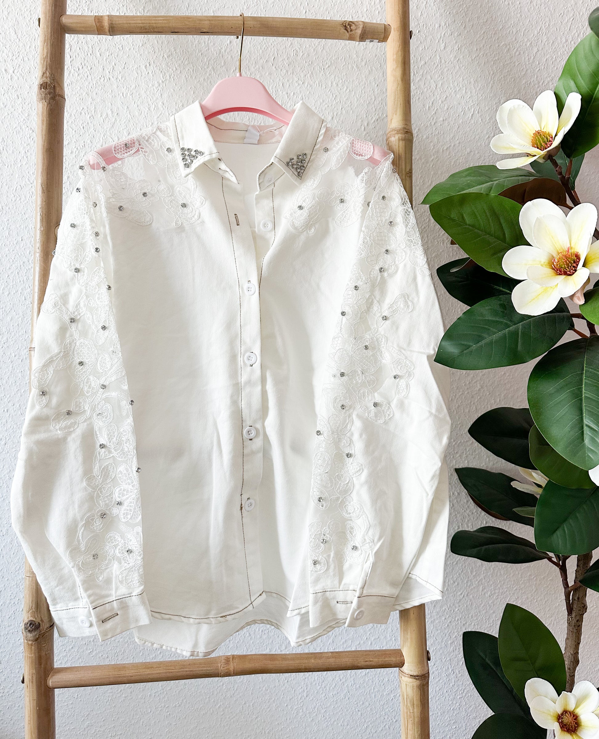 Diese besondere Jeansbluse vereint lässigen Denim mit femininen Spitzendetails. Der weiche, hellblaue Jeansstoff sorgt für einen entspannten Look, während die aufwendig gearbeiteten, transparenten Spitzenärmel mit floralen Stickereien und feinen Perlendetails einen eleganten, romantischen Akzent setzen.