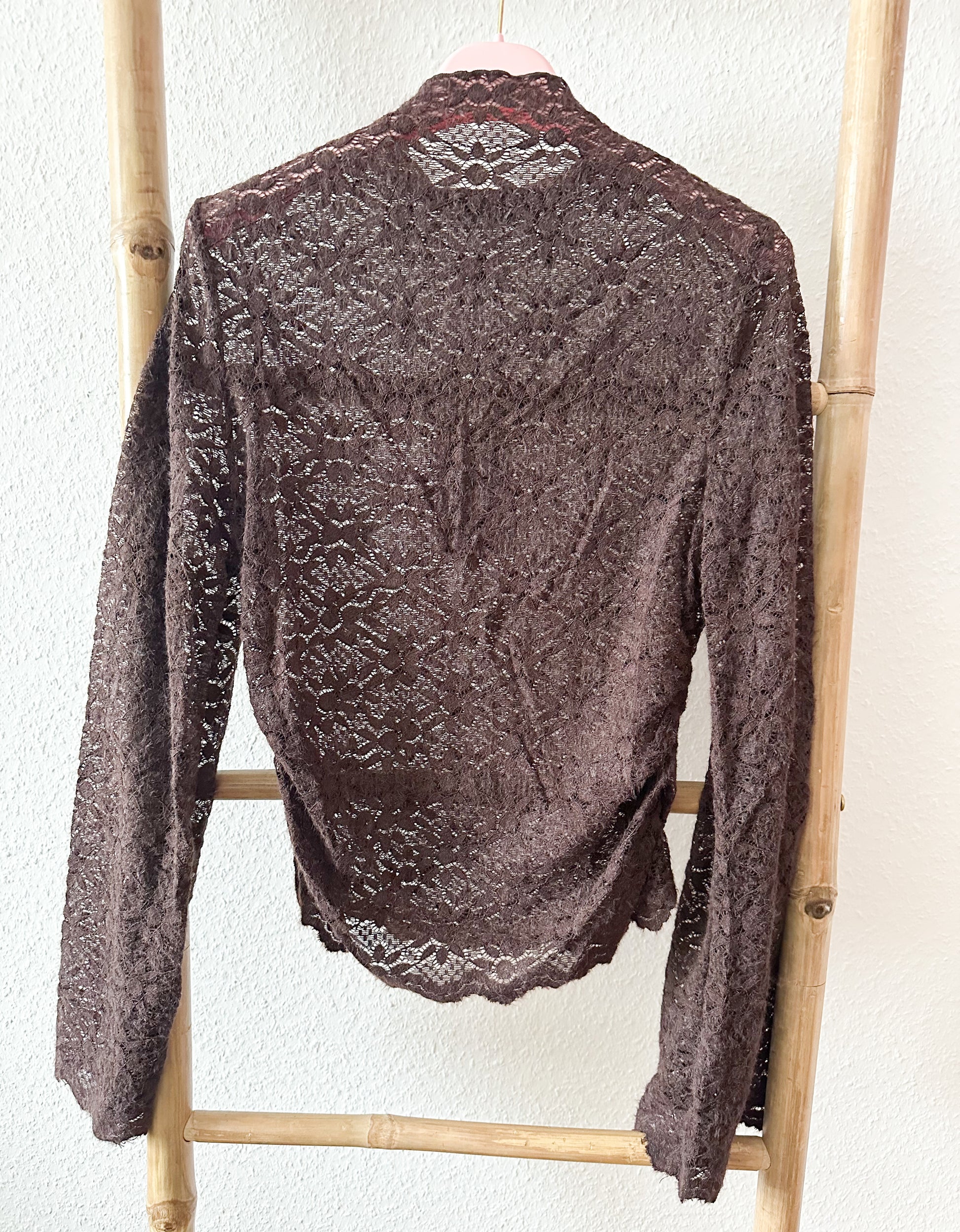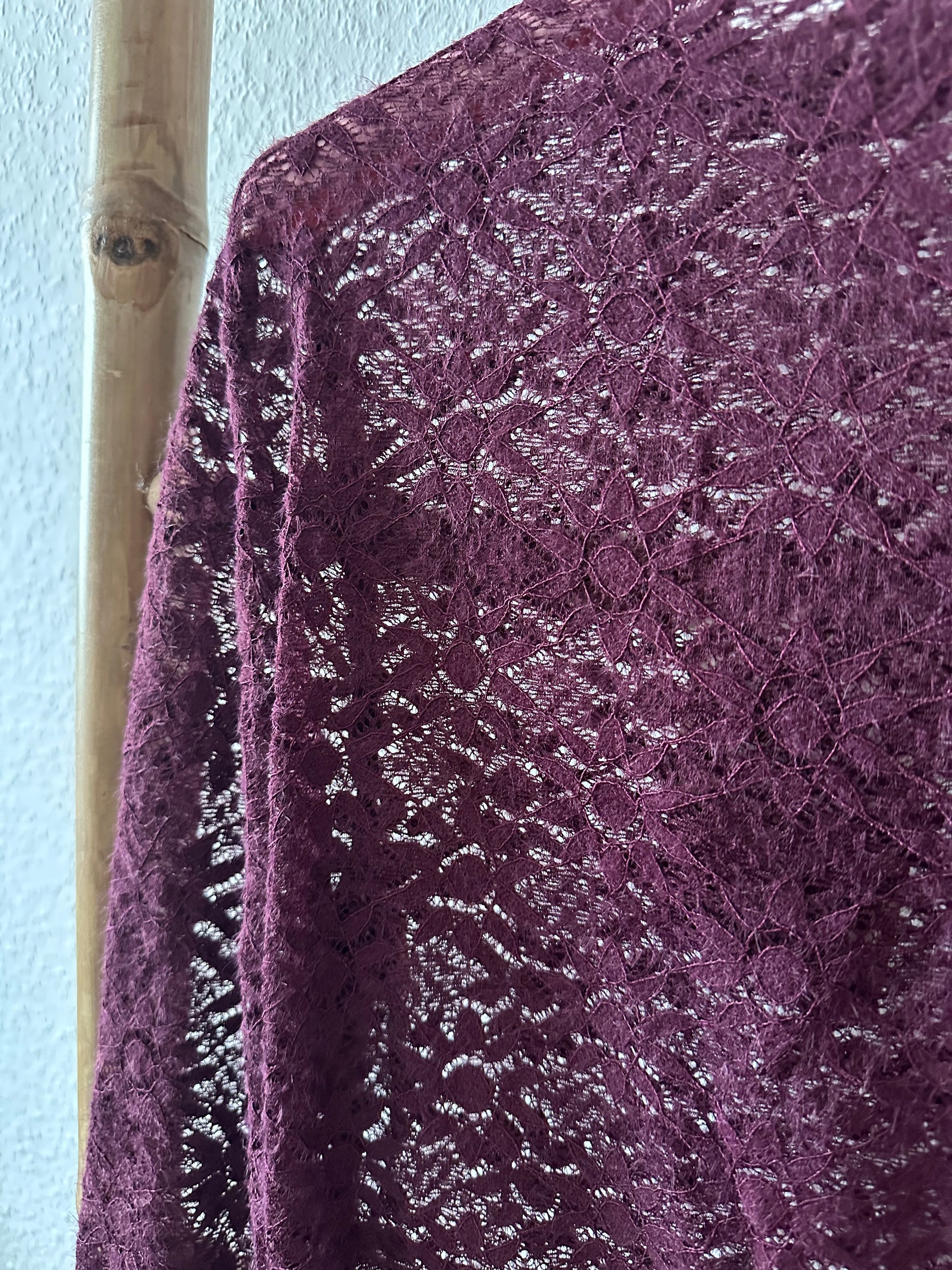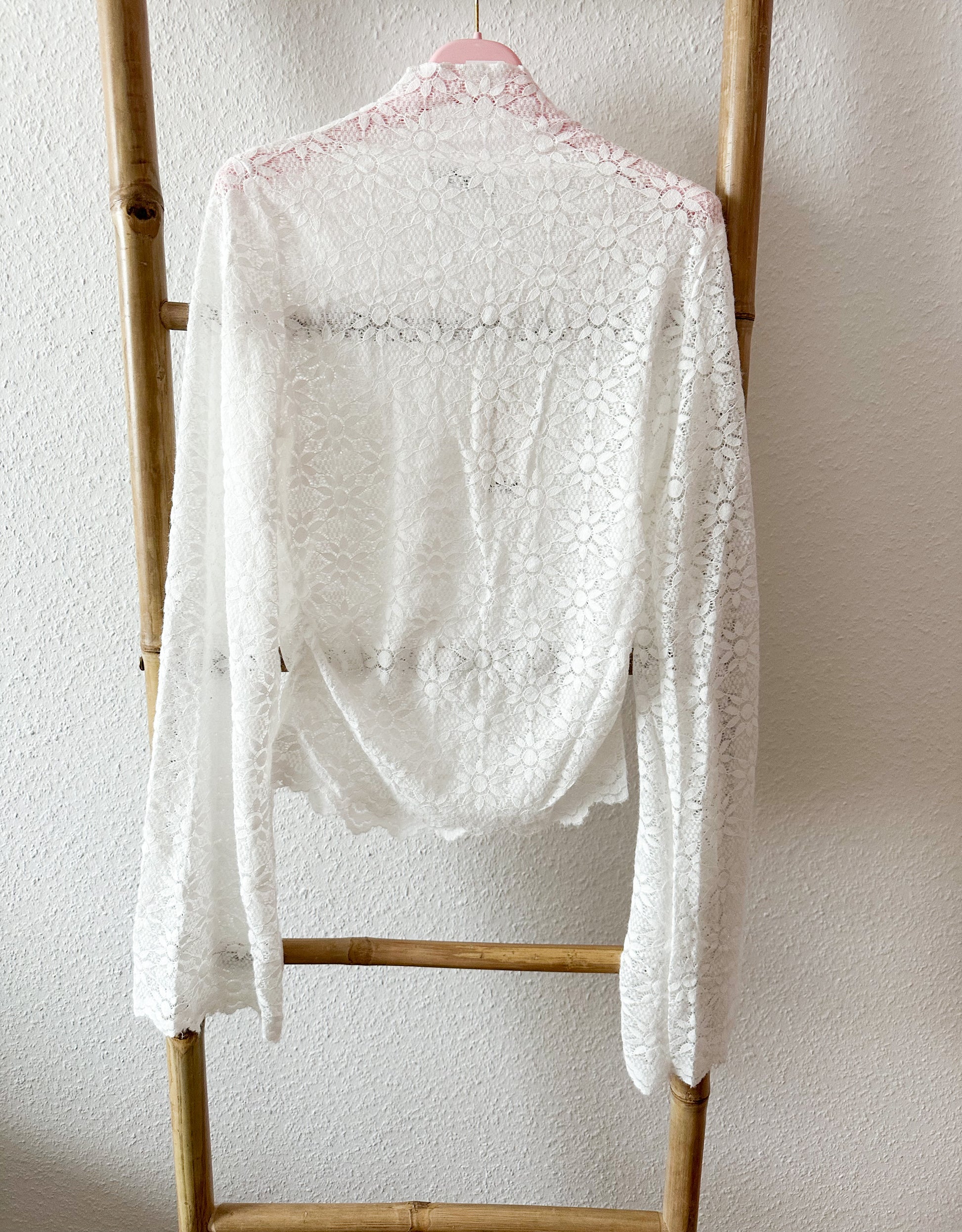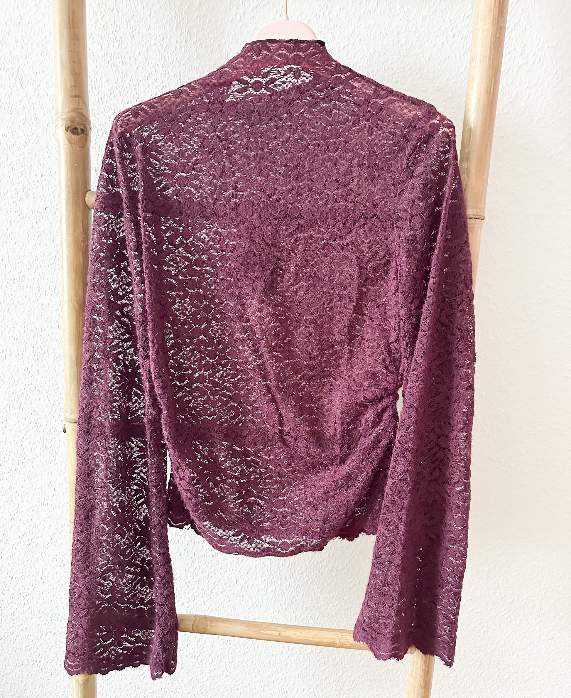 Aufgrund des feinen Spitzenmaterials sollte der Pullover nicht an Schmuck, Reißverschlüssen oder rauen Oberflächen hängen bleiben. Bitte vorsichtig an- und ausziehen, um Fadenzieher zu vermeiden.