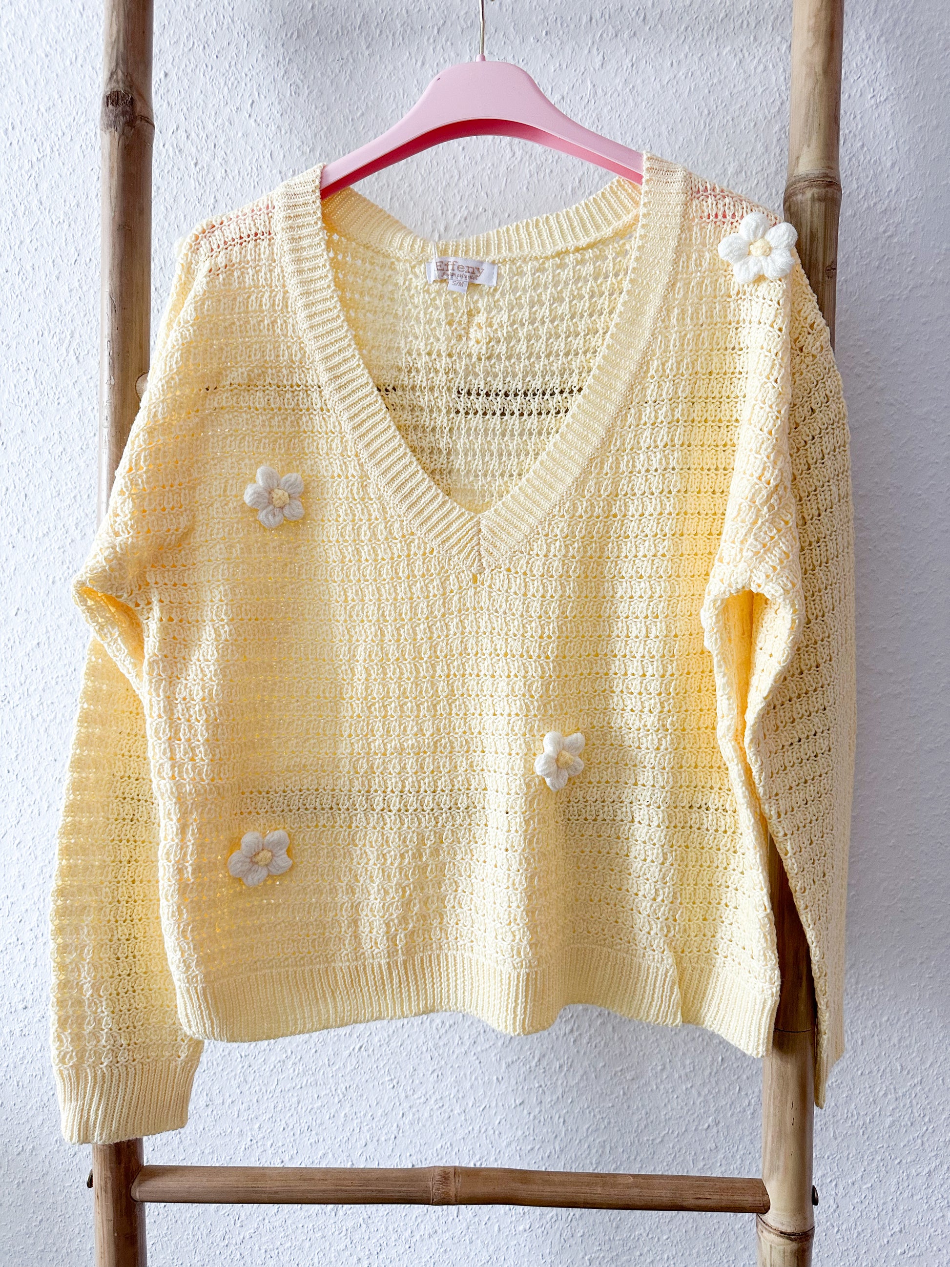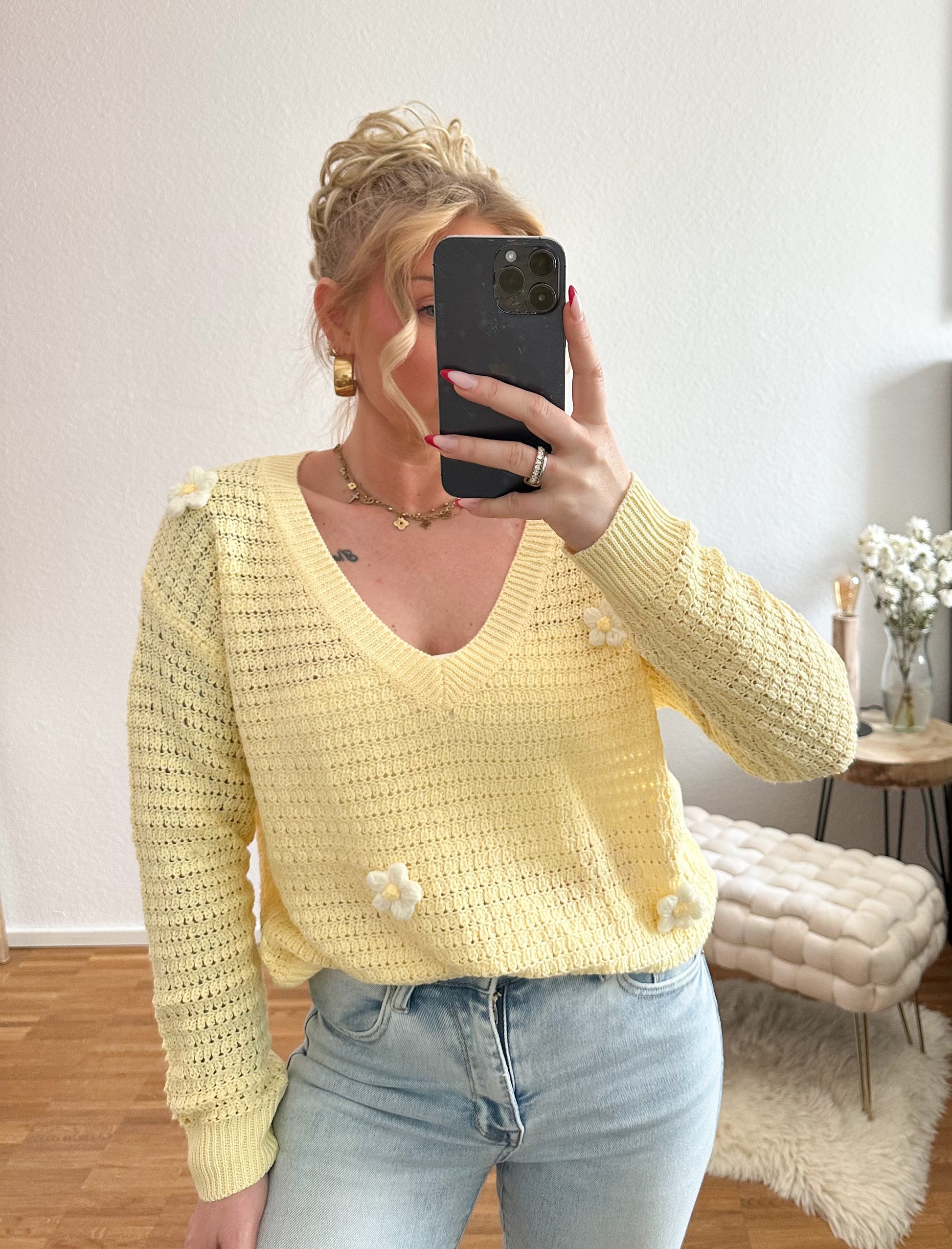 Der locker gestrickte Stoff fühlt sich angenehm weich auf der Haut an und bietet durch seine luftige Struktur optimalen Tragekomfort. Der feminine V-Ausschnitt schmeichelt dem Dekolleté, während die süßen, aufgenähten Blumen-Applikationen dem Pullover einen romantischen und besonderen Touch verleihen.