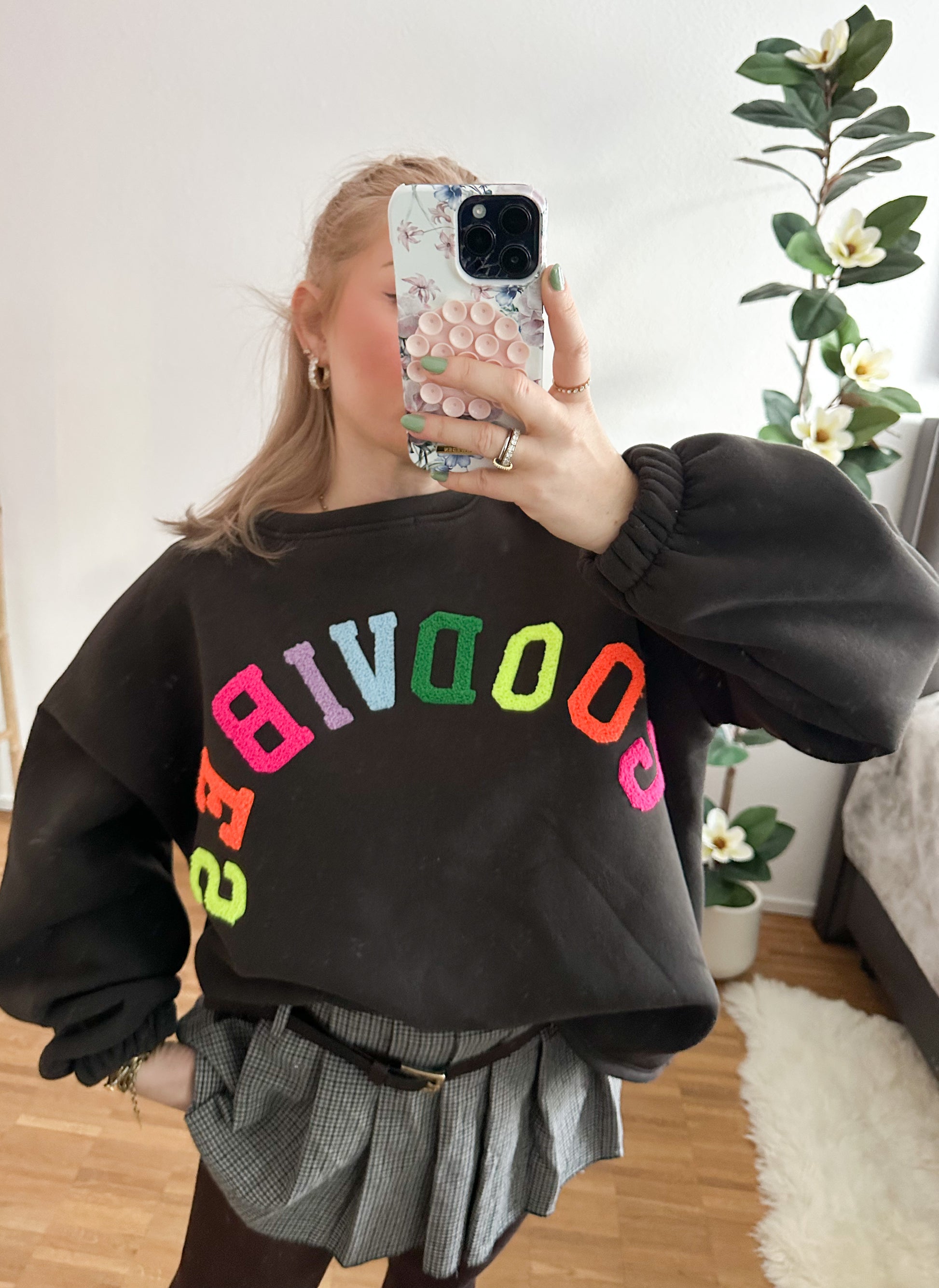 - Auffällige Teddy-Schrift „GOOD VIBES“ in bunten Farben