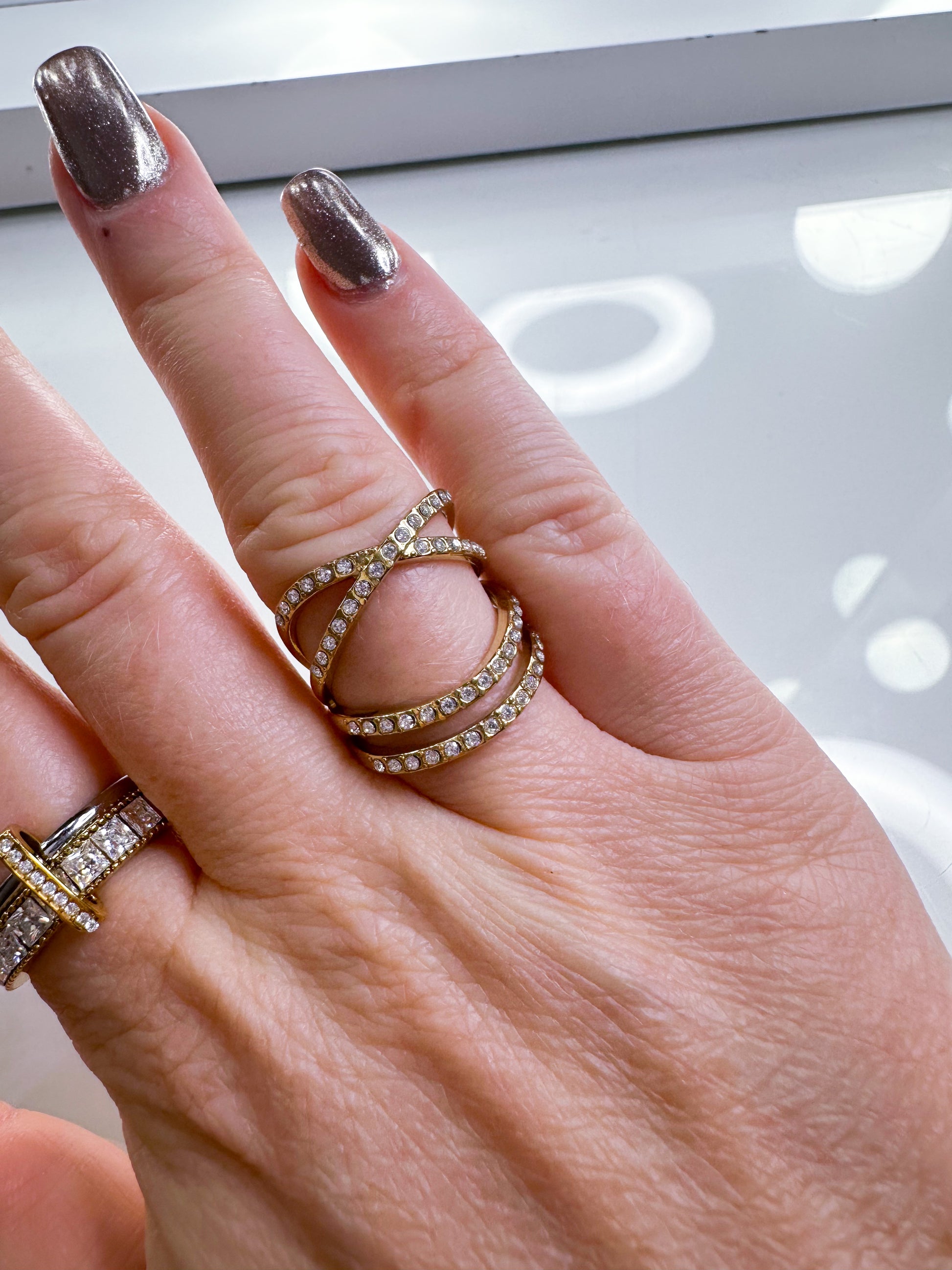Der „Cross Lines“ Ring ist ein echter Hingucker: Mehrere sich überkreuzende, filigrane Linien bilden ein modernes, edles Design, das durch zahlreiche funkelnde Zirkonia-Steine perfekt abgerundet wird. Der Ring besteht aus hochwertigem, langlebigem Edelstahl mit goldfarbener Beschichtung – ideal für alle, die eleganten, auffälligen Schmuck lieben.