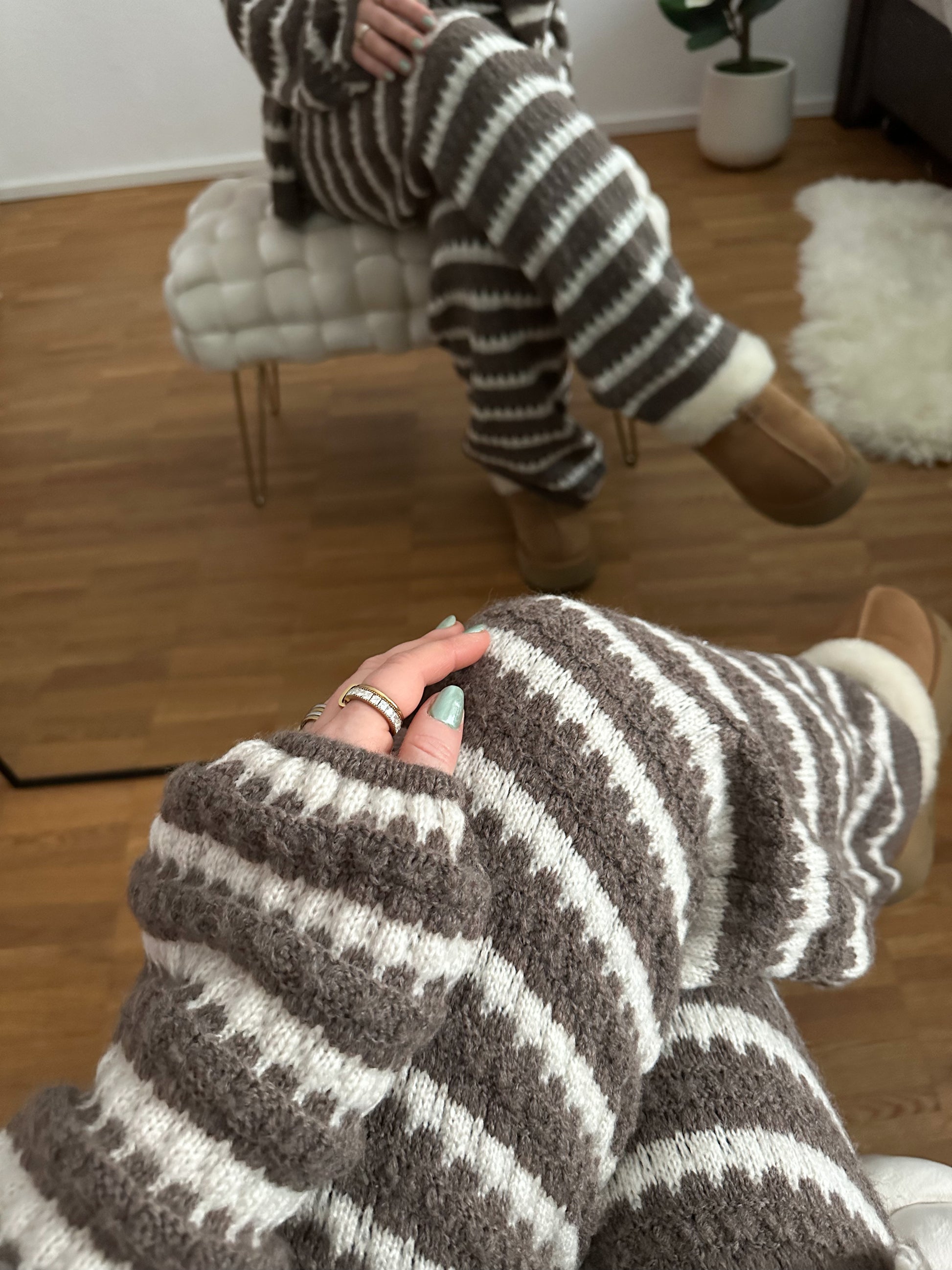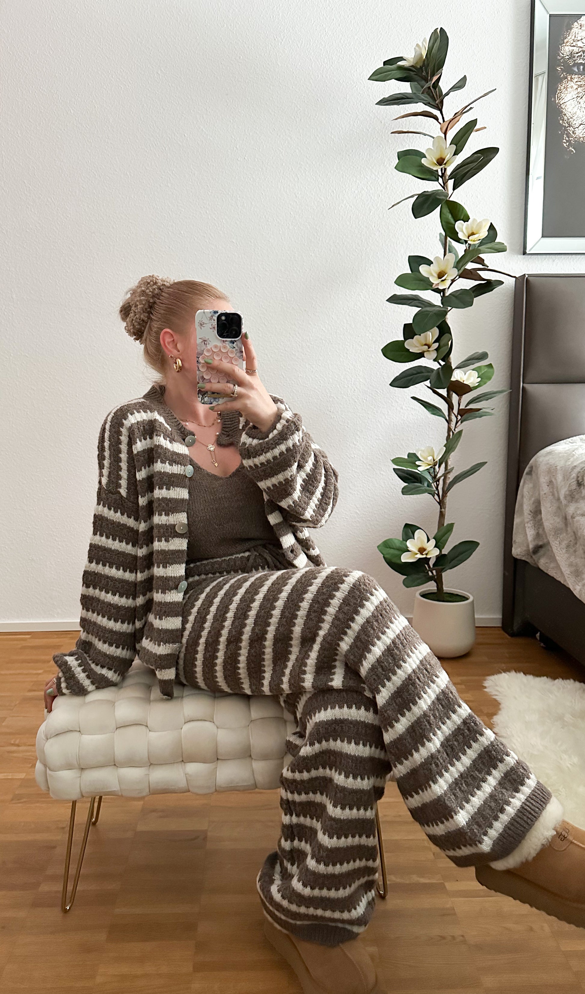 Unsere Cozy Stripe Stoffhose ist der perfekte Mix aus Komfort, Stil und Gemütlichkeit. Der weiche, flauschige Stoff schmiegt sich angenehm an die Haut und sorgt für ein kuscheliges Tragegefühl – ideal für entspannte Tage, stylische Alltagslooks oder gemütliche Homewear-Outfits.
