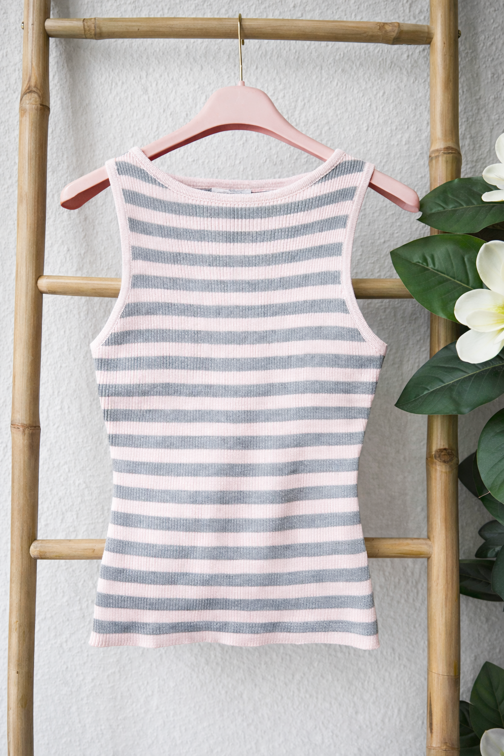 Mit seinem zarten Streifenmuster in Rosa-Grau wirkt es feminin, modern und gleichzeitig zeitlos.