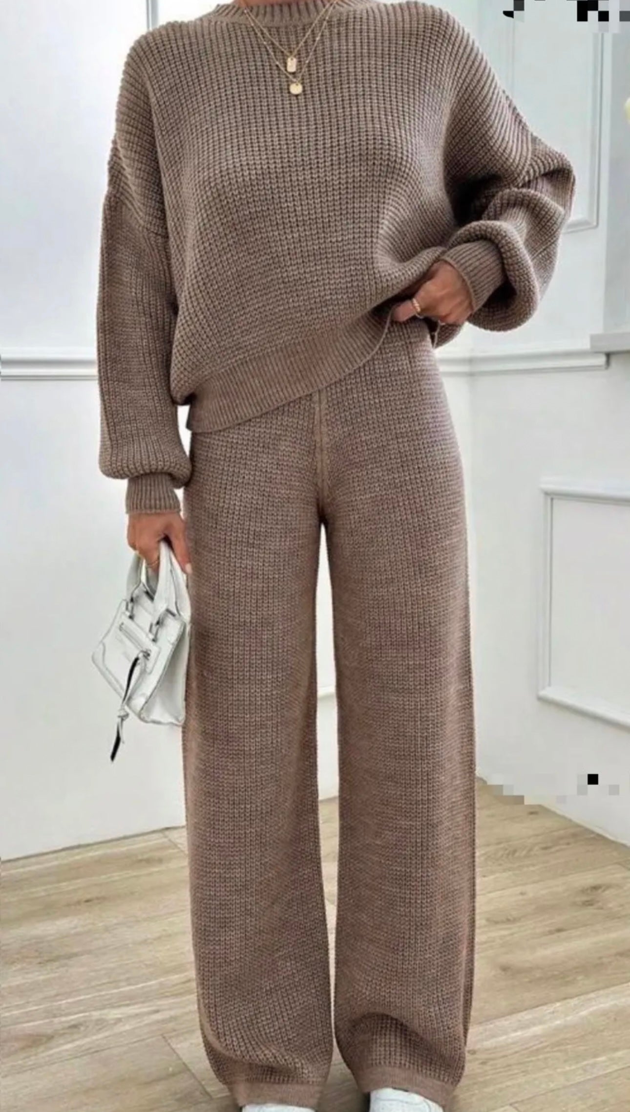 Wunderschöner Zwei-Teiler. Strickjacke im Corsagen Stiel. Weit ausgestellte Hose mit Schlag. Breiter gerippter Gummibund. Ein Zwei-Teiler der Sportlich und lässig ist. Model trägt regulär Größe 36 (S) und ist 159 cm groß.